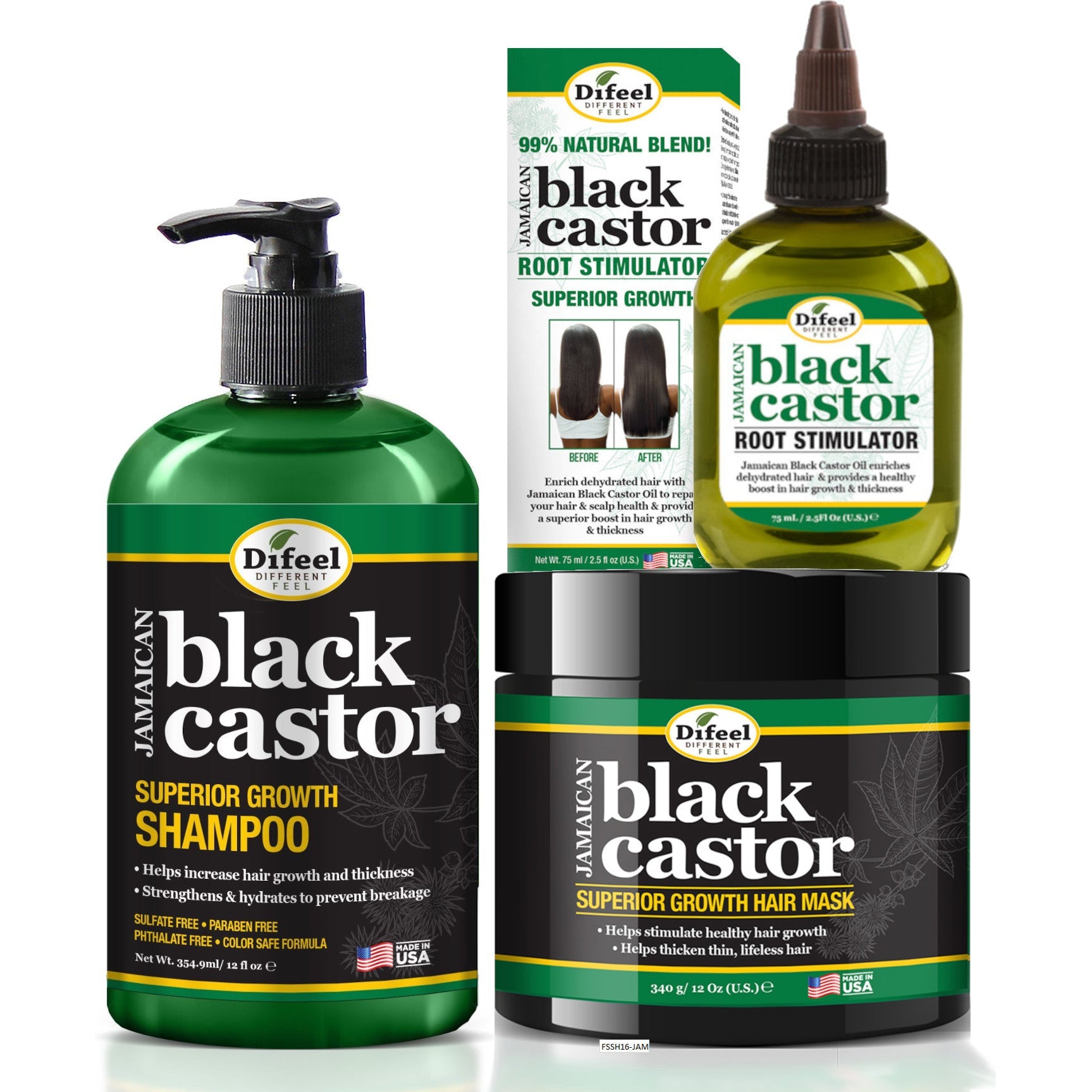 Difeel Superior Growth Jamaican Black Castor 3-PC Hair Care Set - Includes 12 oz. Shampoo, 12 oz. Hair Mask & 2.5 oz. Root Stimulator